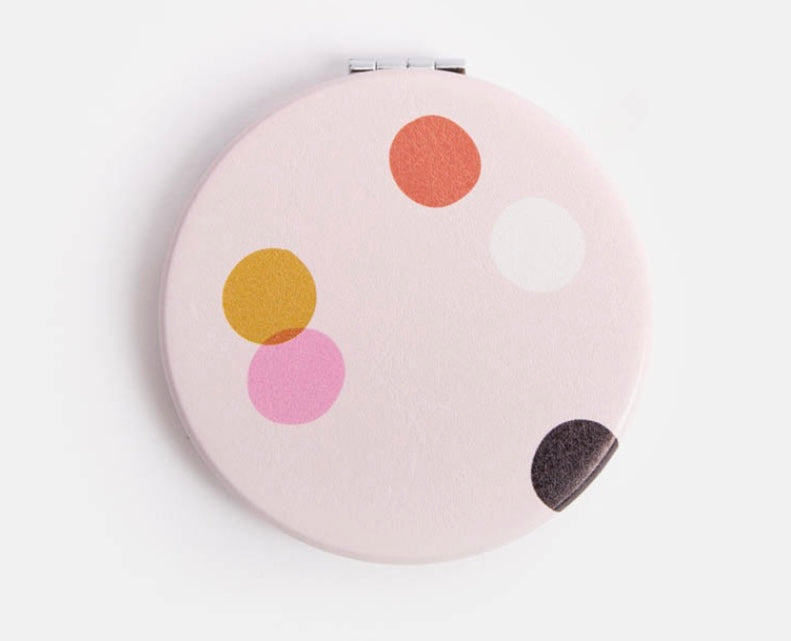 Round pocket mirror in branded card box packaging. The hinged magnetic closure keeps it secure and opens up to reveal two mirrors - one with magnification, great for all those on-the-go makeup touch-ups.