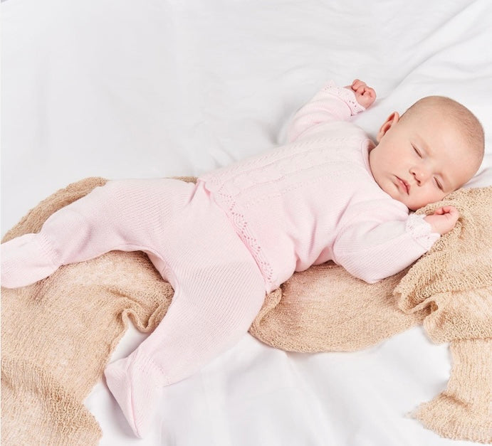 The pink trouser with feet and the classic knitted top with scalloped cuffs and hem make for an incredibly stylish and traditional look.