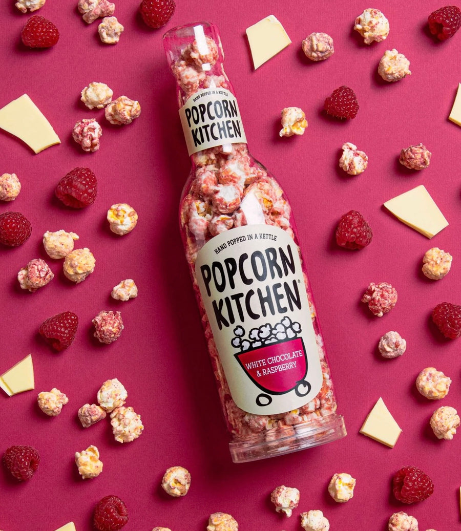 Our hand-popped gourmet popcorn smothered in Belgian white chocolate and freeze dried raspberries, what a flavour combination!