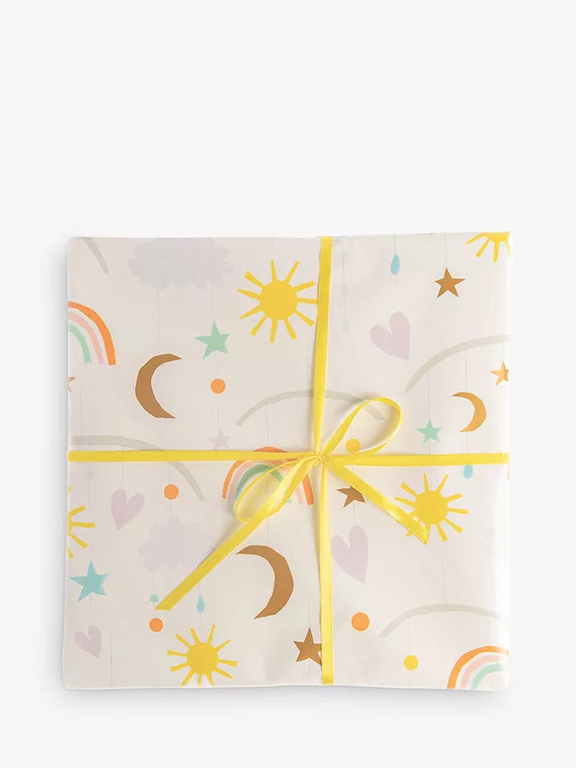 Complete your gifts for that special little one with this beautiful rainbow motif roll wrap. This wrap is supplied as a 5m roll with cello free packaging. An extra 10cm is included to allow for trimming.