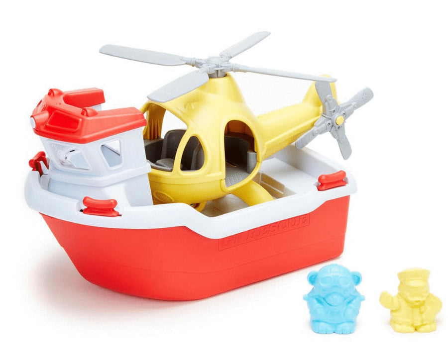 No water rescue is out of reach when the Green Toys™ Rescue Boat & Helicopter gets the call! This two-in-one toy is just as fun on land as it is in water, with a bright yellow, full-size Helicopter nestled on the back deck of the red and white Rescue Boat. The set also includes two characters – a Captain Duck and Pilot Bear – ready to go wherever your child’s imagination takes them. Specially designed to float in the water and open for the dishwasher, this ship is a perfect addition to any bathtub fleet.