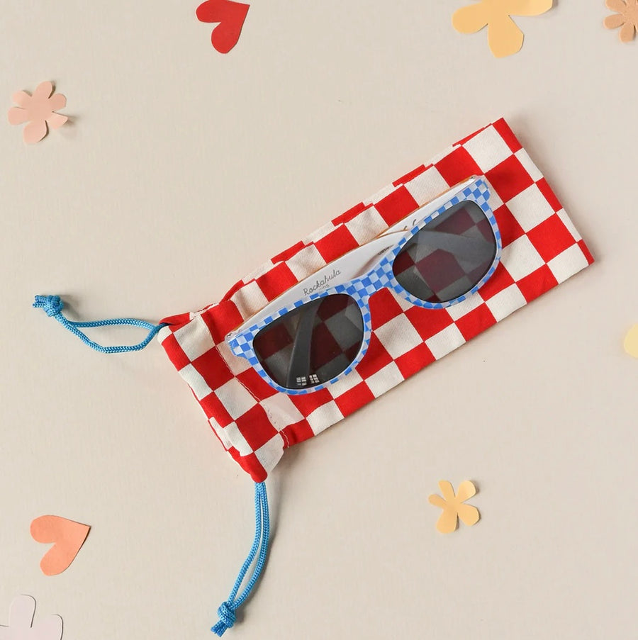 Ready, set ... go! Protect your eyes in retro style in these cool racing check sunglasses! With a fun check blue print, and yellow stripe frame, each pair comes with a protective red check cotton case, and offers full UV protection.