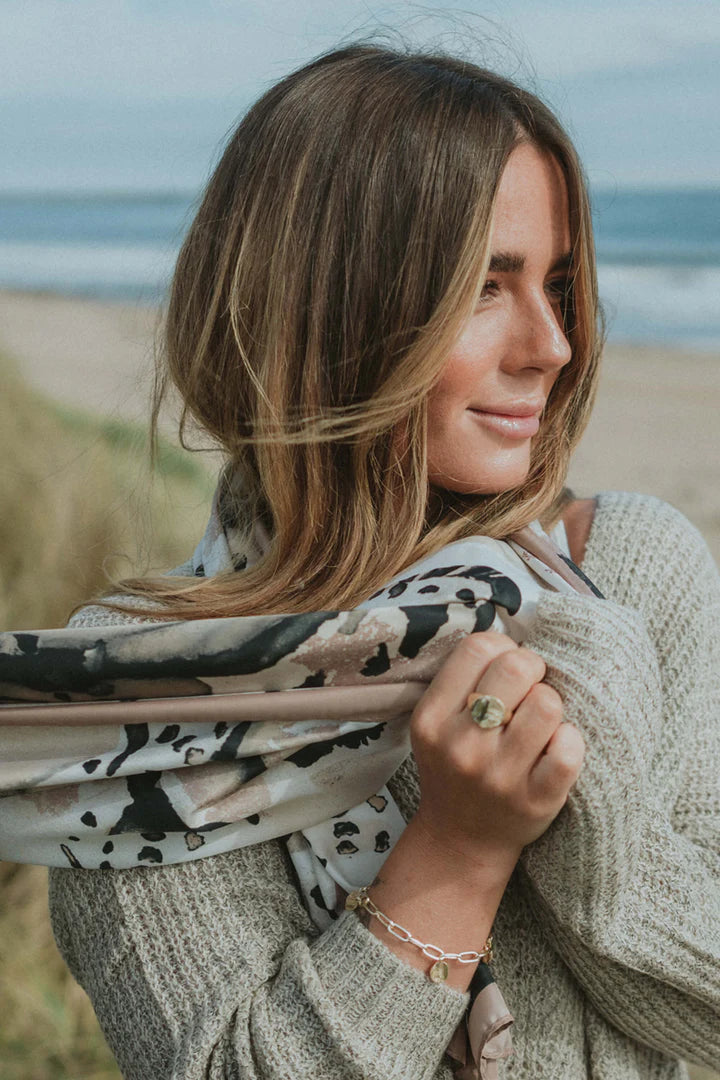 A contemporary hand painted watercolour abstract animal scarf inspired by subtle animal print, finished in modern colours of blush, stone, black, grey, and gold.