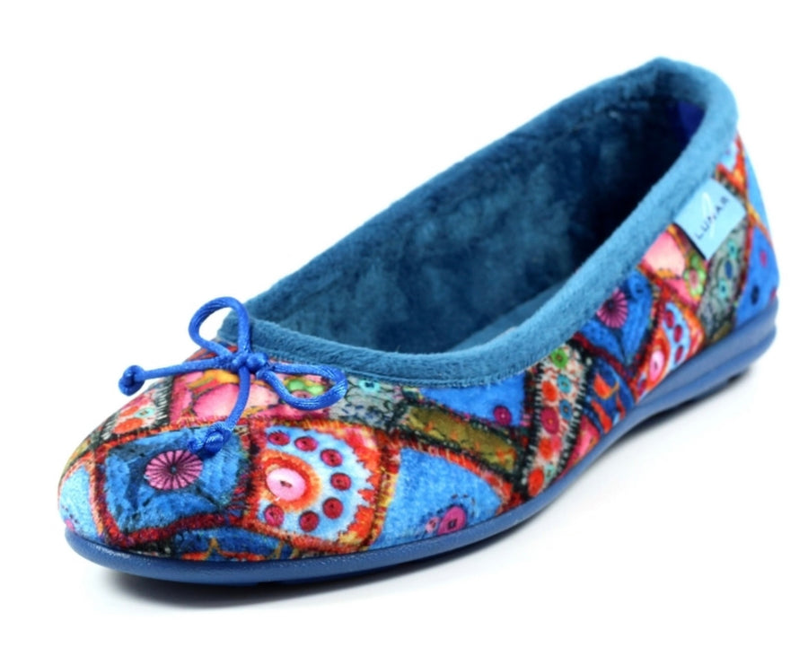 Elevate your loungewear game with the Sangira Blue Pump Slipper. The upper is made from a printed textile, while the lining is super soft fleece, providing warmth and luxurious cushioning. The synthetic sole ensures durability and a sturdy grip. The slip-on pump design is effortless to wear, and the padded insole with soft fleece trims adds extra comfort. Adorned with an all-over multicolored pattern of patchwork prints, buttons, and stitches, alongside a charming bow decoration, these slippers exude a unique and stylish charm.