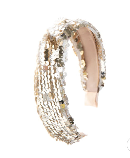 Gorgeous shimmering sequins adorn this wide headband which features a twisted knot detail. With grosgrain ribbon wrapped ends to ensure a comfortable fit for little heads, this is an essential party must have!