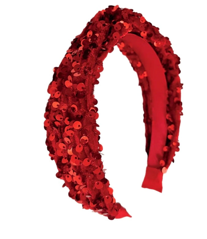 Gorgeous shimmering sequins adorn this wide headband which features a twisted top detail. With grosgrain ribbon wrapped ends to ensure a comfortable fit for little heads, this is the perfect headband for winter parties!