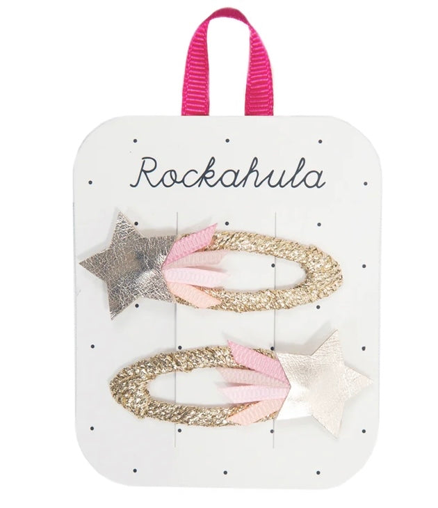 You can wear the stars in your hair with our beautiful clips! Two shimmery leatherette stars, each with pastel ribbon tails secured to a gold ribbon wrapped snap clip.