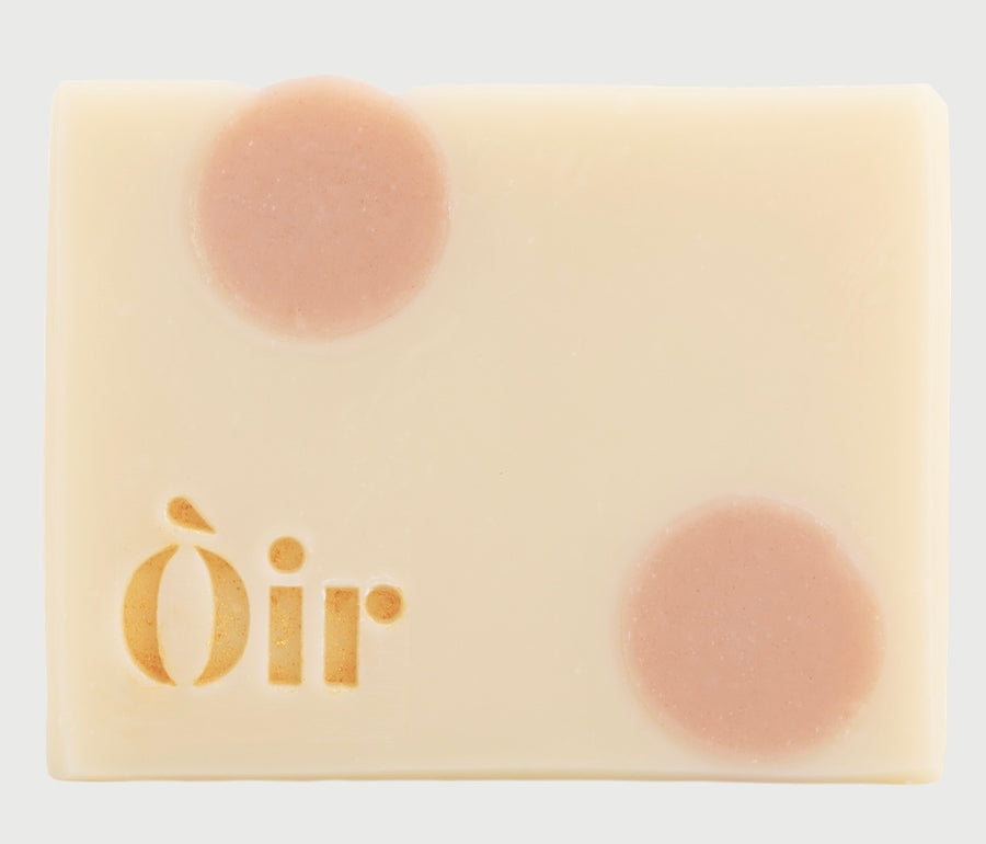 Ingredients: sodium olivate (olive oil), sodium cocoate (coconut oil), sodium shea butterate (shea butter), sodium castorate (castor oil), sodium cocoa butterate (cocoa butter), aqua (water), glycerine, pelargonium roseum leaf oil (rose geranium essential oil), kaolin, gold mica (CI 77019, 77891, 77491)