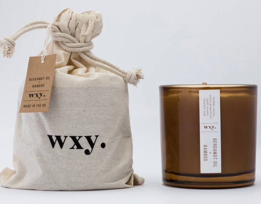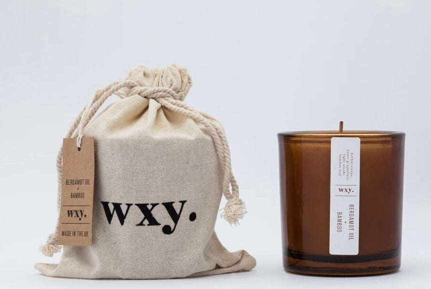 Wood wick, thick heavy amber glass contained in a wxy. printed cotton bag.