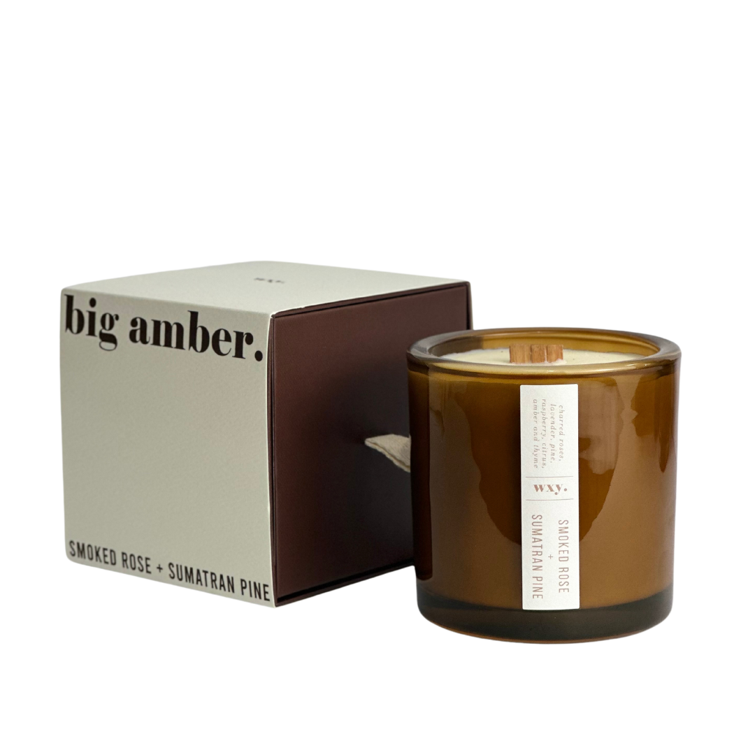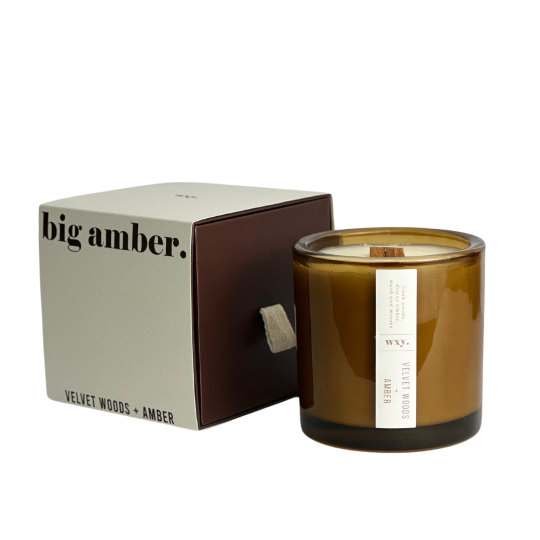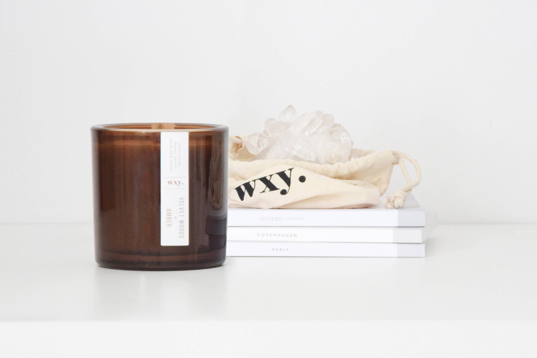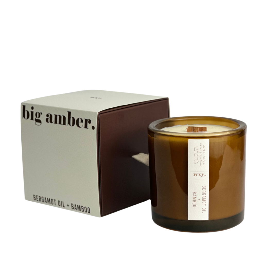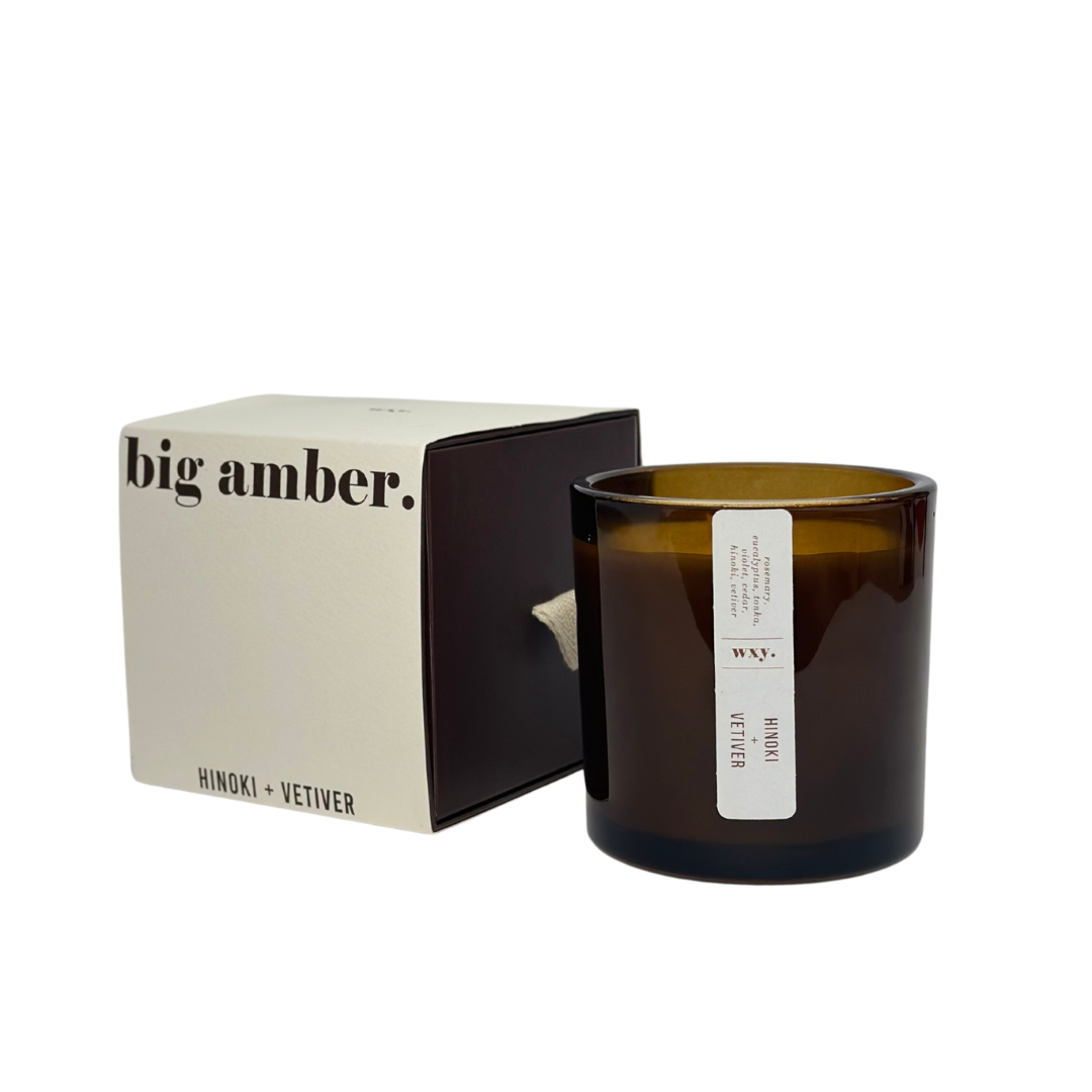 12.3oz of 100% plant-based wax in thick-walled amber glass. glass easy to reuse after the candle has finished. A wxy. bestseller. Made in the UK. Charity donation.