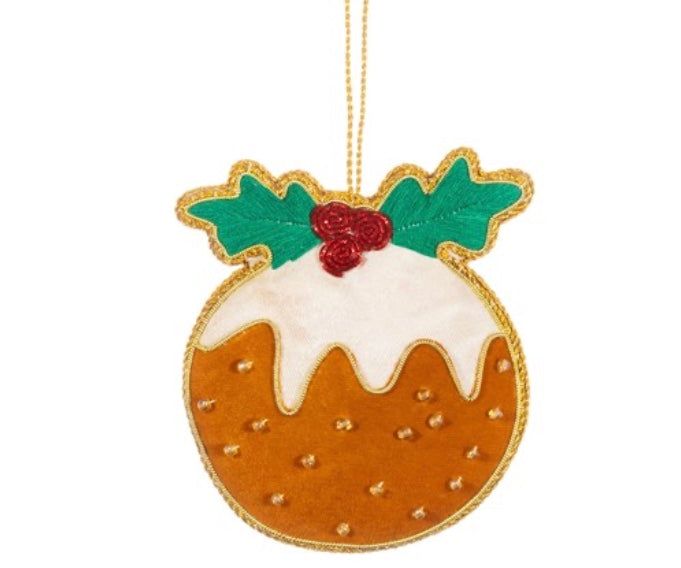 Did someone say dessert? Discover a special sparkle for the tree with this beautiful decoration. Handmade using a traditional Indian embroidery technique, this Christmas pudding design features a festive colourway of green, white, red and gold.