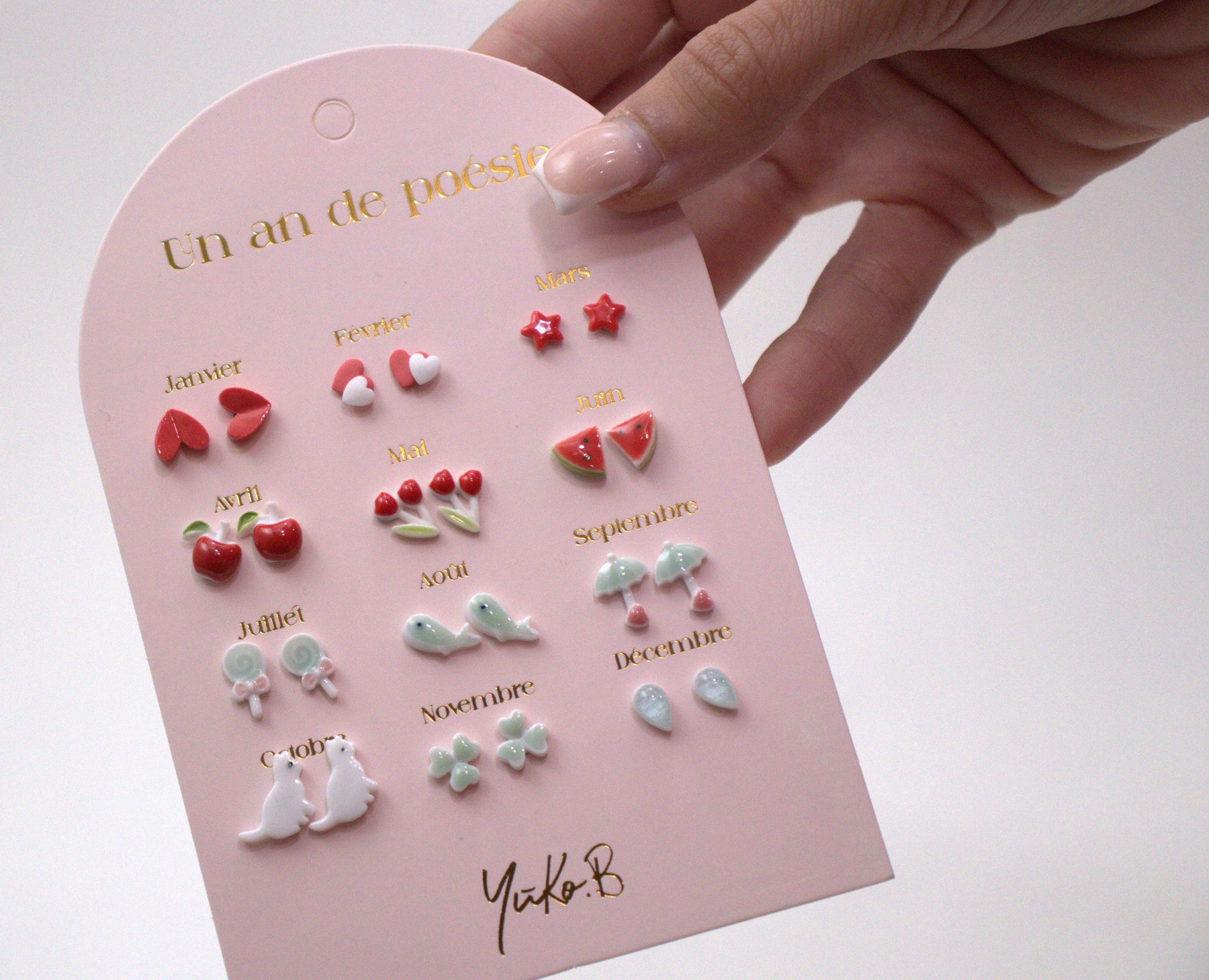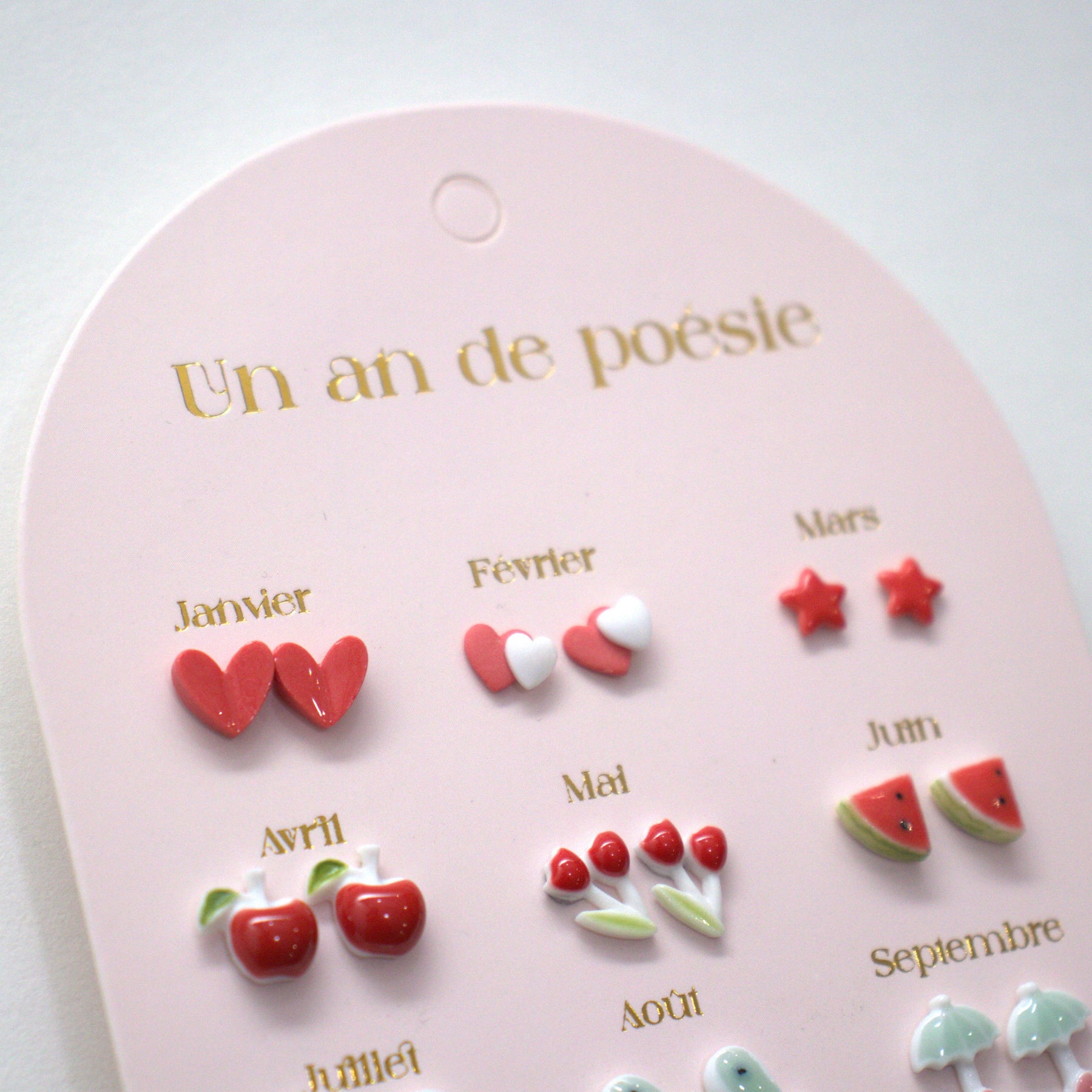 A card of 12 pairs of pierced earrings, based on the theme of red and water, to change over the months of the year.